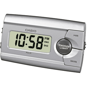 BudíkNapájení z bateriePouzdro ve tvaru obdelníkuPlastové pouzdroStříbrná barva pouzdraDigitální ciferníkCiferník s arabskými číslyLED osvětlení displejeBudík przeczytaj całość