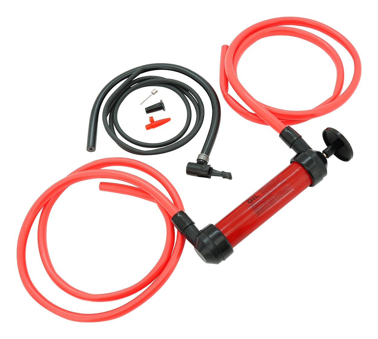 Balení obsahuje multifunkční pumpu, 2x nasávací / hustící hadici, hadičku pro odsávání motorového oleje, hadičku pro huštění kol a adaptéry.