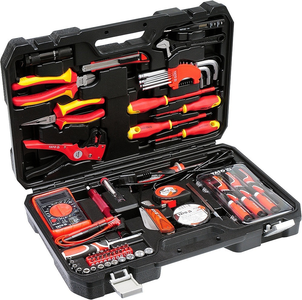 Profesionální sada nářadí YATO pro elektrikáře. Obsahuje 68 speciálně vybraných nástrojů vč. multimetru, šroubováků a kleští, které jsou izolovány do 1000V. V praktickém a robustním kufru s kovovými sponami.
