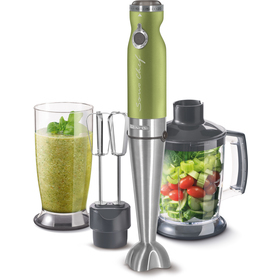 6 lat gwarancji na silnik Technologia TITANIUM QuadBlade Moc 1 200 W Bardzo cichy silnik DC Płynna regulacja prędkości (20 stopni) Ergonomicznie wyprofilowany uchwyt Nierdzewna nasadka nadająca się do mieszania gorących potraw Nierdzewne ostrze siekające Akcesoria 800 ml pojemnik do miksowania z pokrywką Nierdzewna końcówka do ubijania z dwoma trzepaczkami Rozdrabniacz o pojemności 1 250 ml z nierdzewnymi nożami Przyciski do zwalniania odłączanej nasadki Oczko do zawieszania Długość przewodu zasilającego: 1,2 m