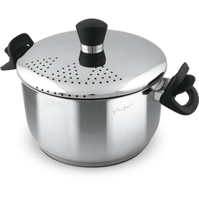 Poklička s cedícím mechanismem z nerezavějící oceli se speciálním zachycením pomocí výklopných rukojetí pro komfortní cedění těstovin
