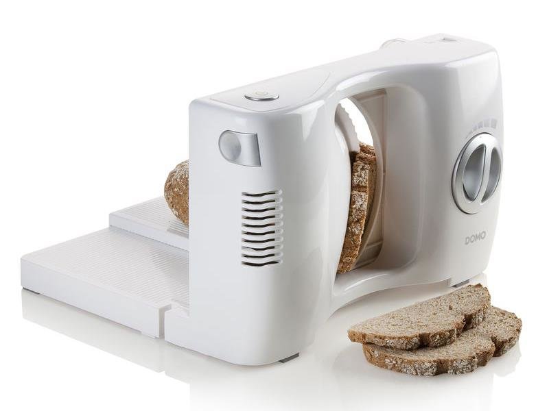 Univerzální sklopný elektrický kráječ Domo s indukčním motorem a 17 cm nožem Soligen. Kráječ umožňuje nastavení tloušťky krájení od 0 do 15 mm. Pro ochranu při manipulaci slouží bezpečnostní vypínač. Kráječ je vybaven umělohmotnou miskou pro nakrájený materiál.