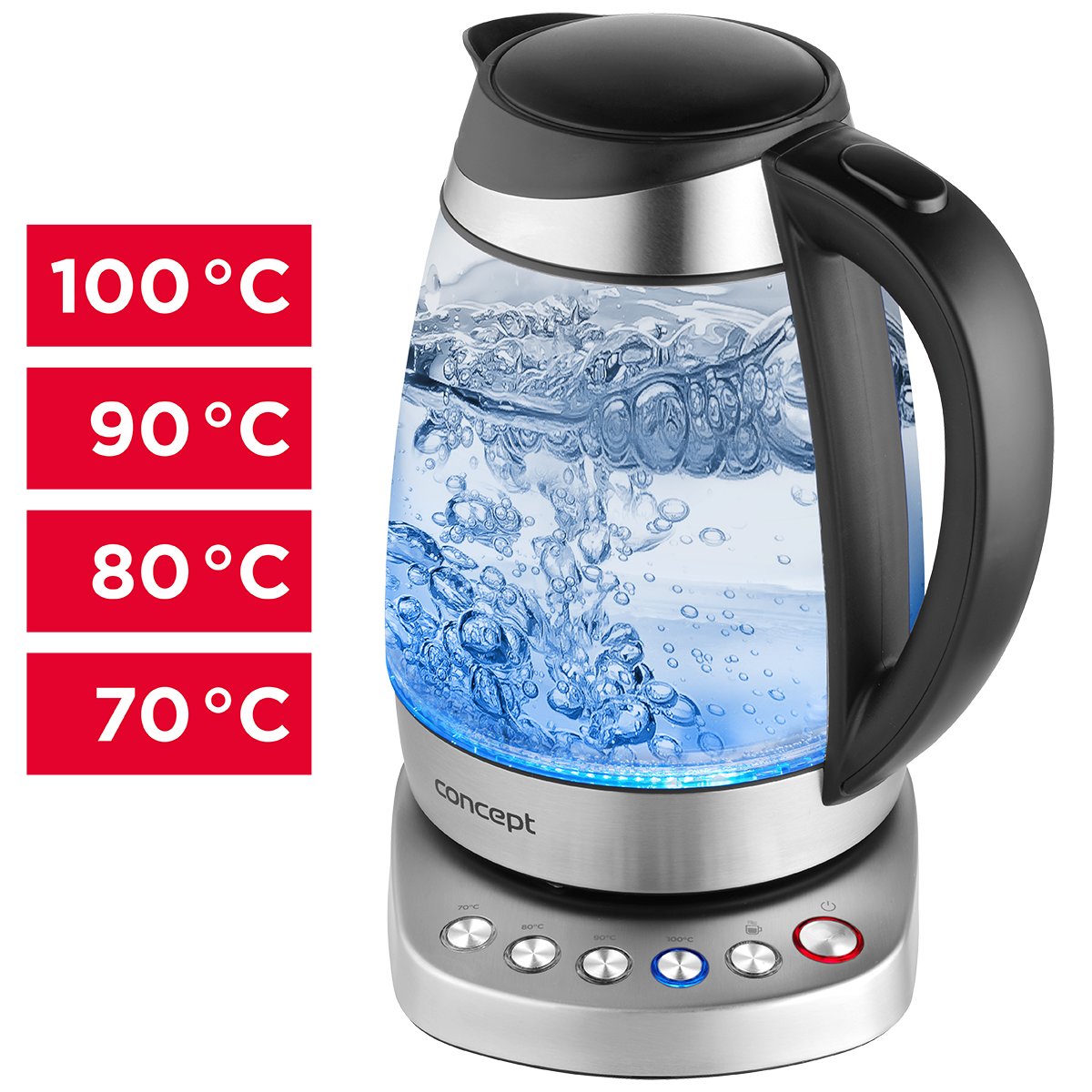 Rozświetl swoją kuchnię nowoczesnym czajnikiem elektrycznym Concept RK4130. Elegancki szklany design z niebieskim podświetleniem LED i zaawansowanymi funkcjami pozwoli przygotować wodę dokładnie według Twoich potrzeb.