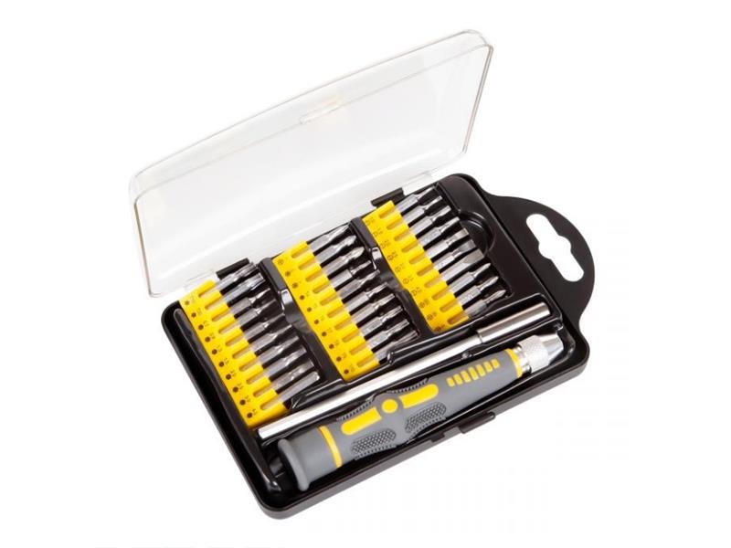 W zestawie bity: • płaski: 1,0 / 1,5 / 2,0 / 2,5 / 3,0 / 3,5 / 4,0 mm • krzyżak PH: PH000 / PH00 / PH0 / PH1 • krzyżak PZ: PZ0 / PZ1 • Torx: T4 / T5 / T6 / T7 / T8 / T9 / T10 / T15 / T20 • imbus (Hex): 0,7 / 0,9 / 1,3 / 1,5 / 2,0 / 2,5 / 3,0 / 4,0 mm