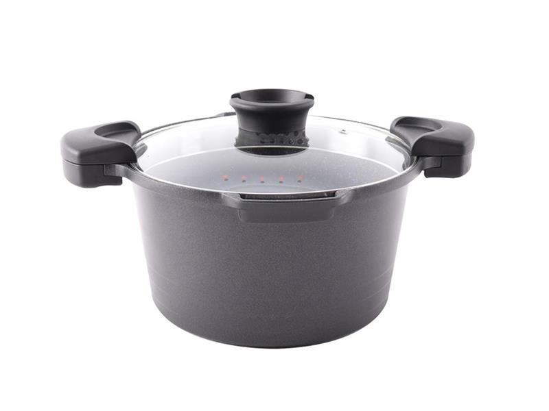 Masivní hrnec PASTA se dvěma výlevkami a s poklicí je opatřen velmi kvalitním nepřilnavým povrchem PFLUON GRANIT. Můžete v něm vařit, dusit i smažit s minimální potřebou tuku. Připravovaný pokrm se nepřipéká. Poklice s otvorem pro únik přebytečné páry je navíc opatřena otvory na cezení vody (dvě...