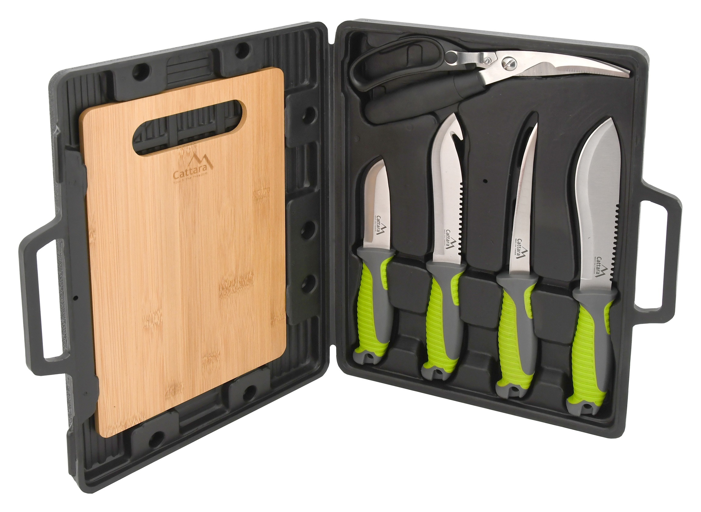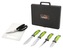 Grilovací sada skládající se ze 4 ks nožů, nůžek na drůbež a ryby a prkénka pro pohodlné porcování.