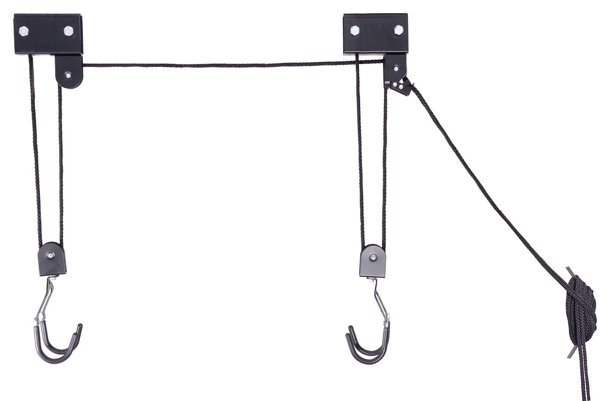 Uniwersalny uchwyt przeznaczony do montażu do sufitu garażu lub innego odpowiedniego pomieszczenia Uchwyt działa na zasadzie bloczka i pozwala łatwo podnosić boks dachowy, drabiny, narty, rowery, kajaki oraz inne podobne duże przedmioty o wadze do 52 kg i umieścić je przy suficie pomieszczenia o maksymalnej wysokości 4 m. Montaż uchwytu odbywa się w mocnych sufitach za pomocą śrub i kołków. Za pomocą liny można łatwo operować zawieszonym przedmiotem. Urządzenie jest wyposażone w hamulec, który zapobiega ślizganiu się liny i uniemożliwia upadek zawieszonego przedmiotu. W opakowaniu znajduje się dodatkowo pas do bezpiecznego mocowania przedmiotów różnego typu i kształtu. Uchwyt jest praktycznym pomocnikiem do przechowywania i oszczędza miejsce.