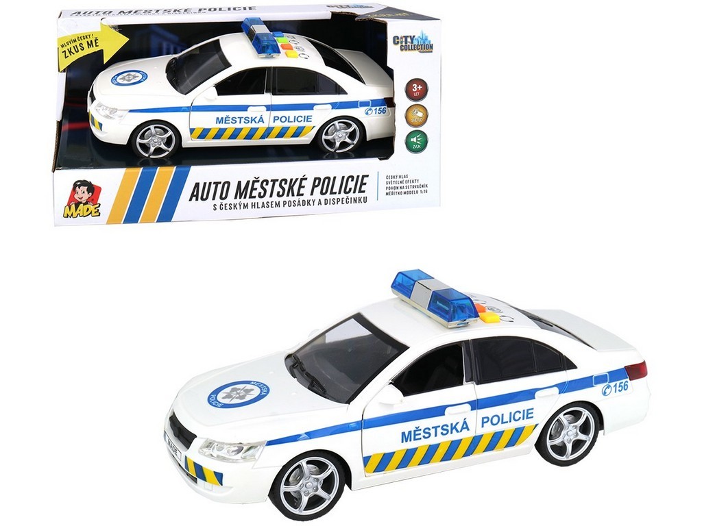 Samochód w czeskim wzorze straży miejskiej z czeskim głosem załogi i dyspozytora (+ działający kogut). "DYSPONUJĄCY: Wszystkim patrolom, wszystkim patrolom. Zgłoszono napad na bank na ulicy Nádražní. ZAŁOGA: Obserwujemy podejrzane osoby przy centrum handlowym. Prosimy o wsparcie i zgodę na interwencję. DYSPONUJĄCY: Wysyłamy na miejsce kolejne patrole. Interwencja dozwolona." Dźwięk i światło koguta. Zasilanie 3 x 1,5V AG13. Wymiary samochodu 24 x 10 x 9 cm. Czeski karton ma wymiary 29 x 12 x 14 cm.