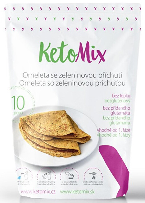 Proteinová omeleta - se zeleninovou příchutí je díky svému složení vhodná nejen pro ketonovou dietu, ale i běžný zdravý jídelníček. Během pěti minut připravíte plnohodnotný pokrm plný bílkovin, vlákniny, vitamínů a minerálních látek. Omelety jsou vhodné už od první fáze diety KetoMix. V první fázi diety KetoMix můžete omeletou nahradit až 5 denních jídel.