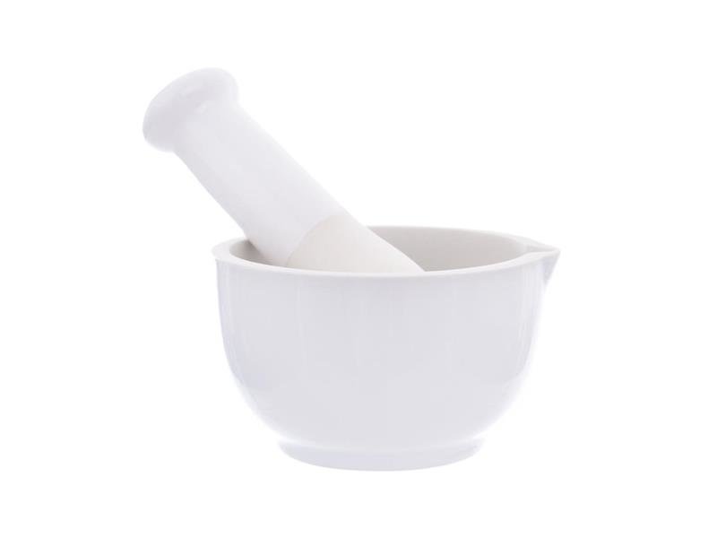 Moździerz z wylewką do rozdrabniania przypraw, ziół, przygotowywania pesto. Materiał: kamionka. Wewnętrzna część moździerza i grubsza strona tłuczka są nieglazurowane - dla lepszego efektu rozdrabniania. Wymiary: śr. wewn. 7,5 cm, śr. zewn. 9 cm, wys. 6 cm, długość tłuczka 12,5 cm. przeczytaj całość