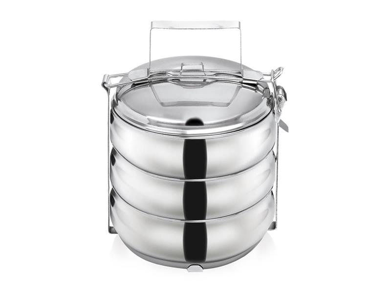 Jídlonosič ORION 3 oblý Jídlonosič 3 patrový je určený na přenášení potravin. Součástí je kovový stojan, opatřený přezkou, která zajistí jeho pevné uzavření, a vrchní poklice.Vlastnosti:- Materiál: nerez- Objem(jednotlivé misky): 1,7L- Průměr(jednotlivé misky): 18cm-... przeczytaj całość