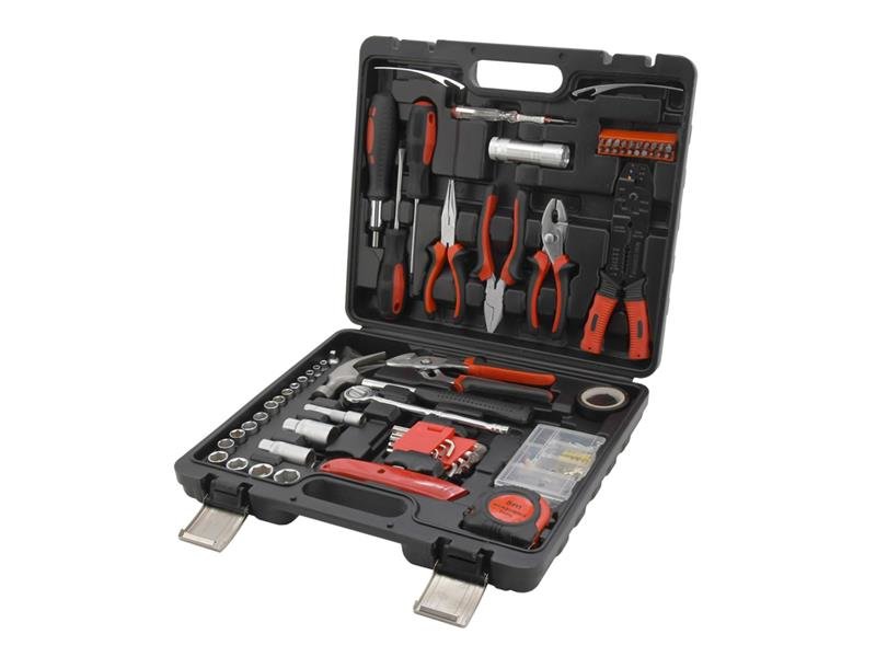 Sada obsahuje ergonomické šroubováky, imbusové klíče, žiletkový nůž, nejběžnější typy kleští včetně elektrikářských, kladivo, 3/8" ráčnu s nástavci, LED svítilnu, šroubovák na bity včetně 20ks bitů, svinovací metr (5 m), izolační pásku a další. Mimojiné je sada opatřena pouzdrem s 92 ks spojovacího materiálu. Kufr s rozměry 38 × 34 × 8 cm je obzvláště vhodný pro domácí použití, ale uplatnění najde i v garážích a na cestách.