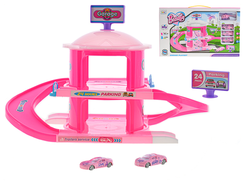 Garáž 40x24x26cm s auty 7cm na volný chod a vrtulníkem v krabičce