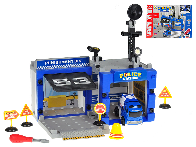 Stanice policejní šroubovací 67ks s autem 10cm na setrvačník v krabičce