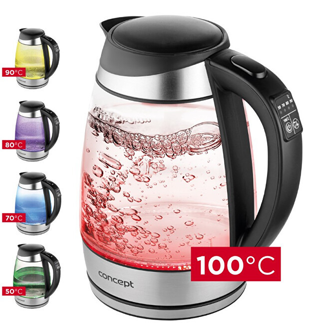 Rychlovarná konvice RK4120 se díky univerzálnímu designu skla stane elegantním doplňkem moderní domácnosti. Příkon 2200 W je zárukou rychlého ohřevu a s objemem 1,7 l připravíte až 7 šálků na jedno naplnění. Moderní vzhled konvice je doplněn o barevné podsvícení závislé na zvolené teplotě, které se díky LED diodám aktivuje po jejím zapnutí.