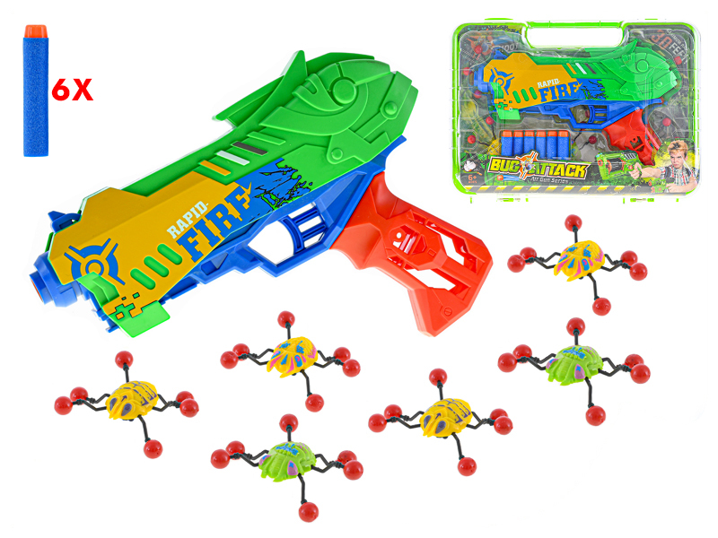 Pistole 24cm na natažení s pěnovými náboji 6ks a hmyzem jako terč v kufříku