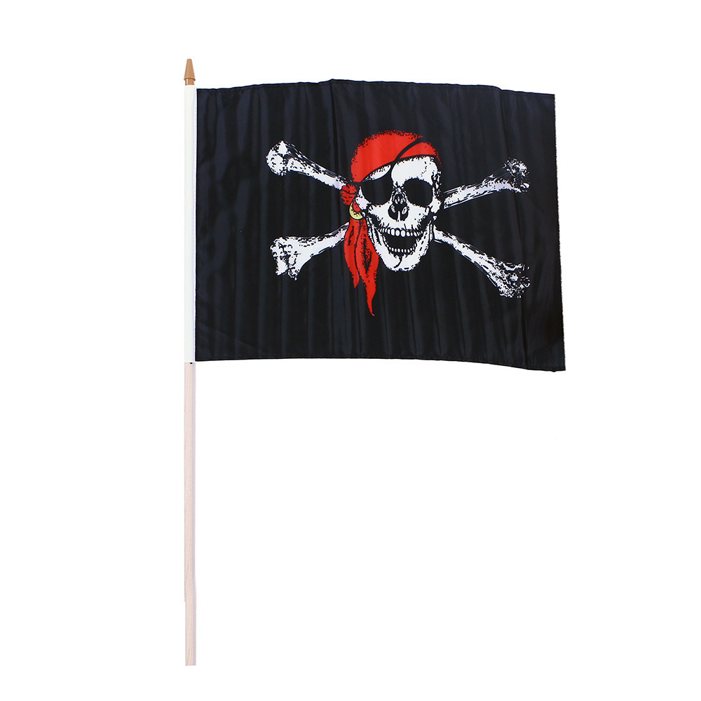 Flaga ma kompaktowe wymiary 47 x 30 cm i jest przymocowana do solidnej drewnianej pałeczki o długości 62 cm, co zapewnia wygodne trzymanie i świetną manipulację. Dzięki stylowemu i zabawnemu motywowi przyciąga uwagę na każdej imprezie i doda niezapomnianej atmosfery prawdziwej pirackiej przygody.
