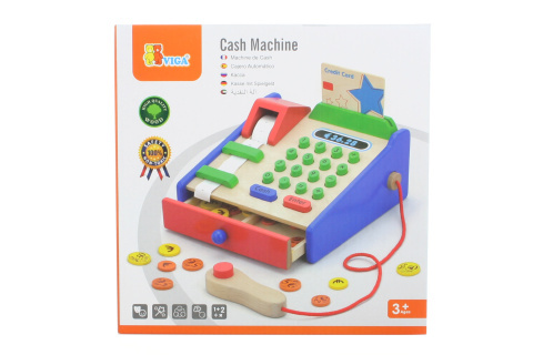 Dřevěná pokladna o rozměru cca 18 x 18 x 9 cm. Obsahuje pokladnu se skenerem a papírovými štítky, 40 dřevěných mincí a kreditní kartu. Rozměry balení cca 22 x 22 x 10,5 cm. Věk 3+ przeczytaj całość