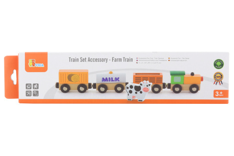Drewniana lokomotywa z 3 wagonikami i krową. Wymiary lokomotywy i wagoników ok. 7 x 4,5 x 2,5 cm, łączenie magnetyczne. Wymiary opakowania ok. 34 x 8 x 3,5 cm. Wiek 3+ przeczytaj całość