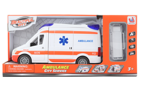 Plastowa karetka na baterie z noszami. Karetka wydaje dźwięki i świeci. Zasilanie: 2 baterie AA (w zestawie). W karetce można otwierać drzwi (w tym tylne). Wymiary karetki: ok. 24,5 x 12,5 cm. Wymiary opakowania: ok. 37 x 17,5 x 11,5 cm. Wiek 3+ przeczytaj całość