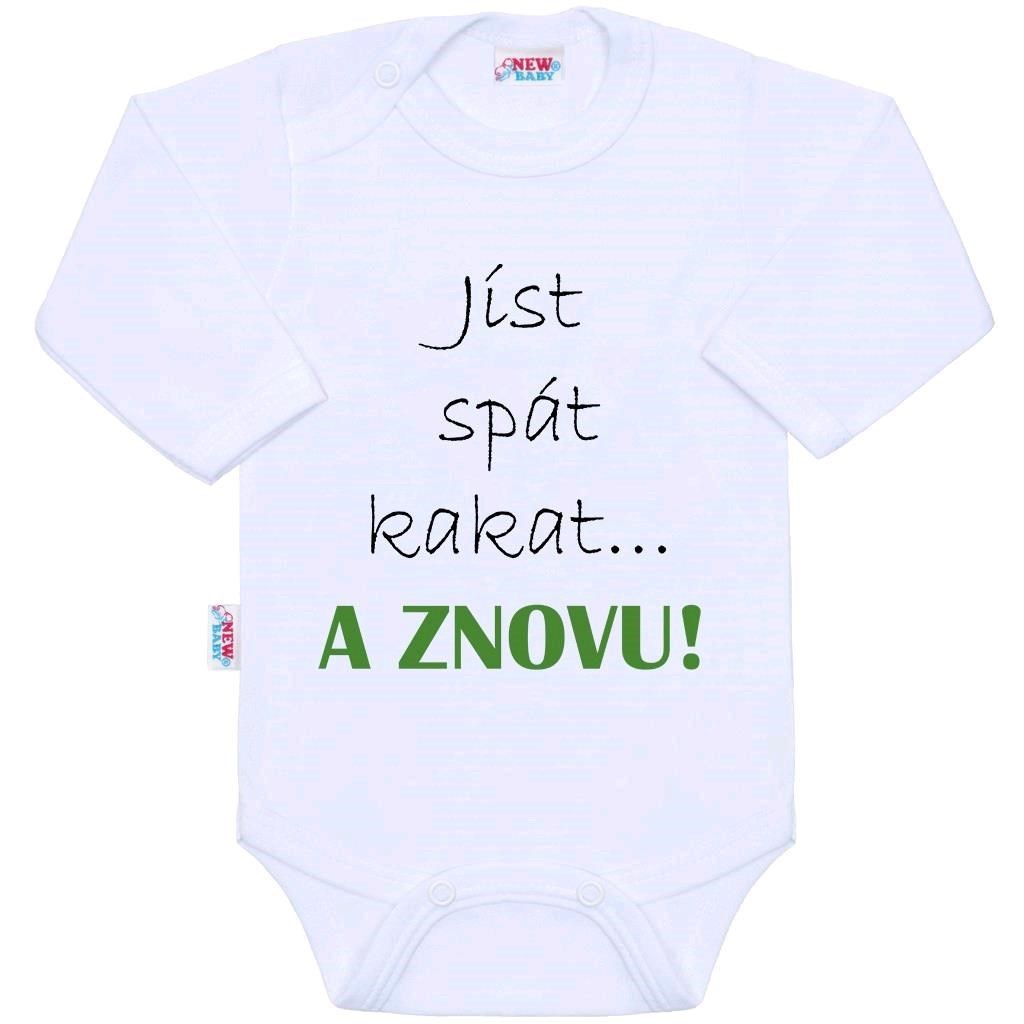 Originální bavlněné kojenecké body s dlouhým rukávem New Baby, s vtipným nápisem jíst spát kakat... A ZNOVU! Barvy použité k potisku jsou certifikované a vhodné pro miminka. Je vyrobeno z příjemného a kvalitního materiálu, ve kterém se bude Vaše miminko cítit příjemně. Body má zapínáni na cvočky...