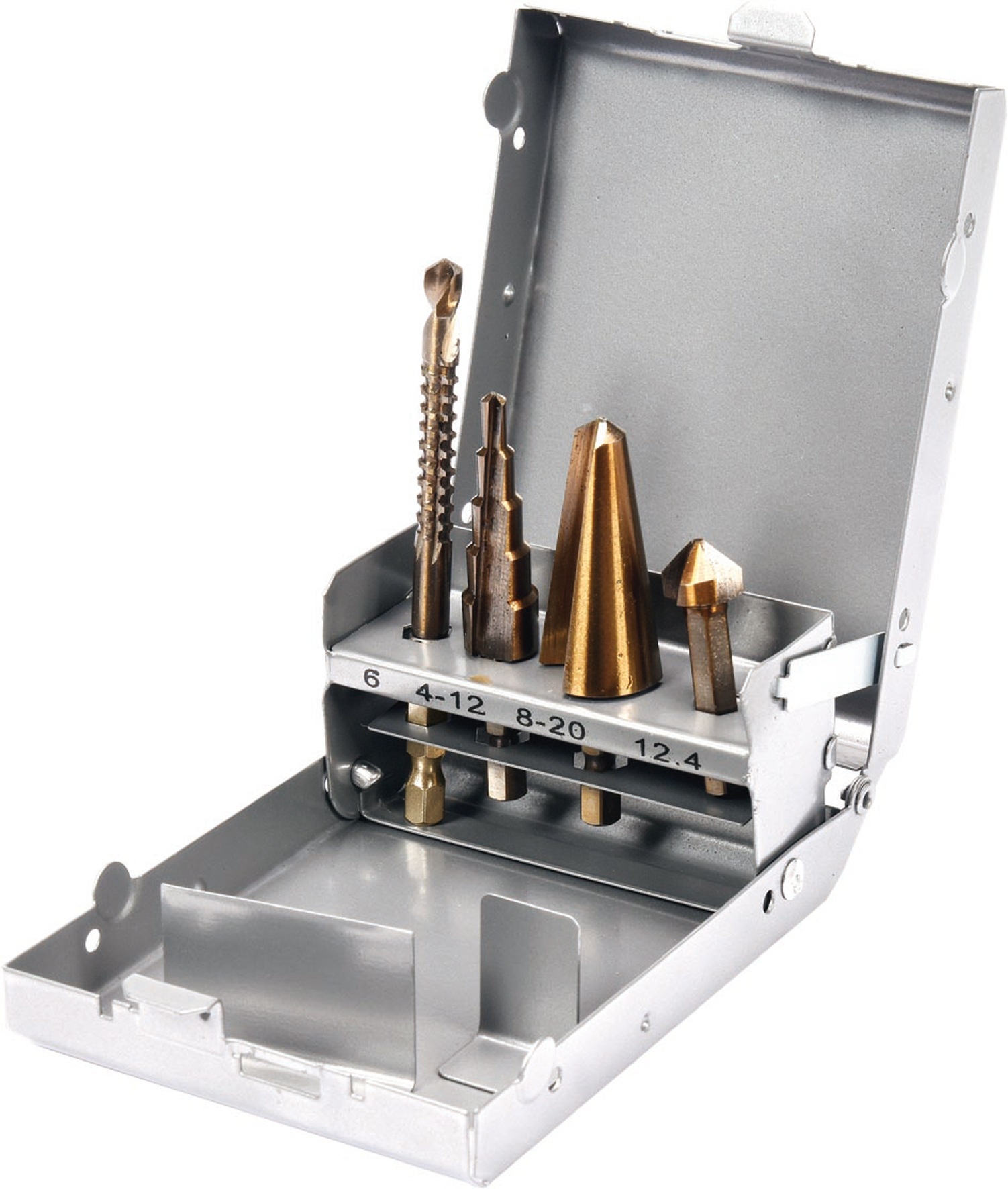 Sada se skládá z výstružníku, záhlubníku, krokového vrtáku a frézovacího vrtáku.