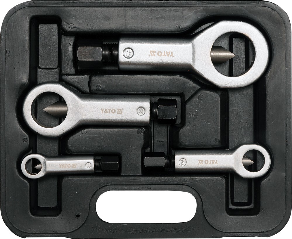 Sada přípravků pro demontáž poškozených a zrezlých matic. V soupravě jsou 4 odstupňované hlavice pro demontáž matic od 9 - 27 mm. Přípravky jsou zhotoveny z chrom-vanadiové, zápustkově kované, kalené a temperované oceli. Souprava pracuje na principu rozštípnutí matice šroubováním. Zakončení...