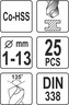 | obsahuje vrtáky | 1; 1,5; 2; 2,5; 3; 3,5; 4; 4,5; 5; 5,5; 6; 6,5; 7; 7,5; 8; 8,5; 9; 9,5; 10; 10,5; 11; 11,5; 12; 12,5; 13 mm |