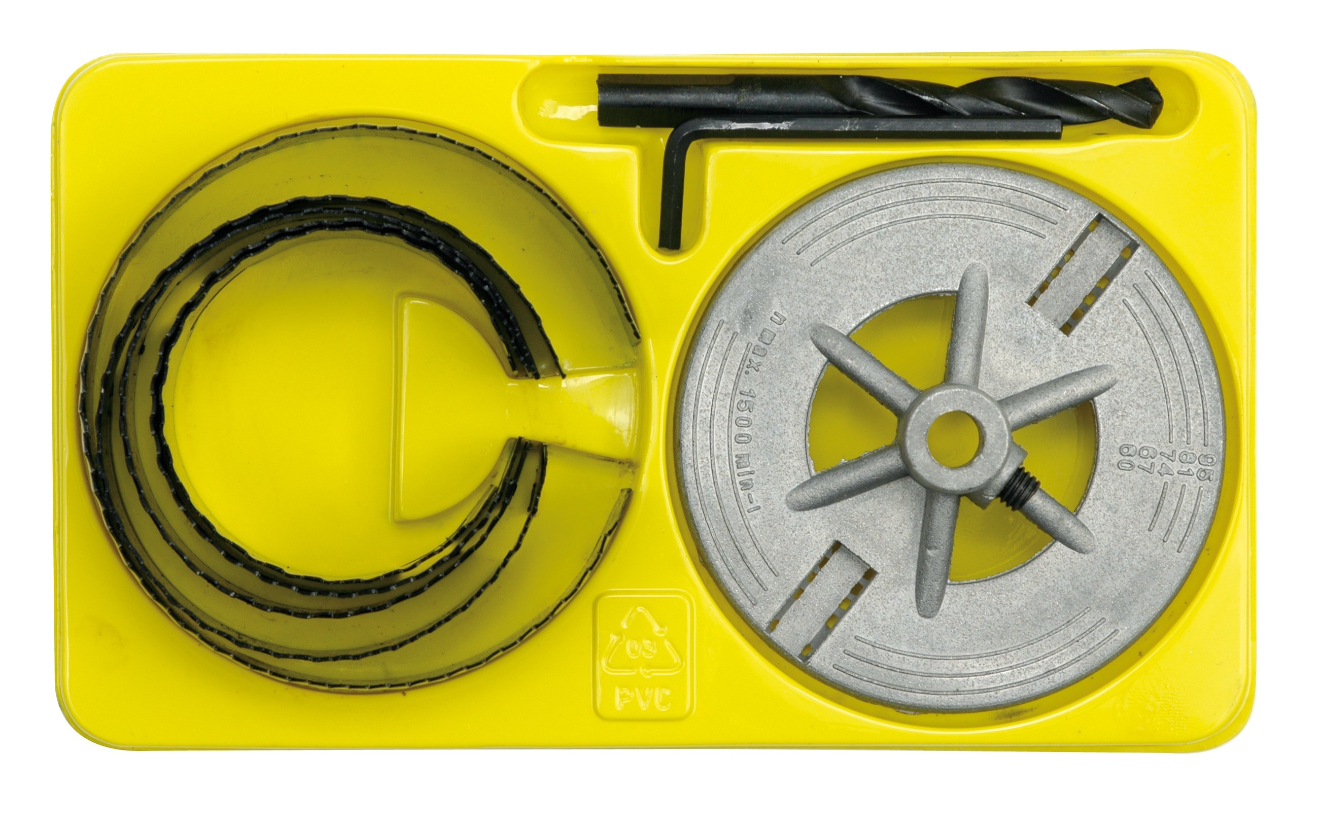 Sada pěti výkružníků píl namontovaných v držáku poháněném elektrickou vrtačkou. Rozsah průměrů od 60 mm do 95 mm. Středový bod je nastaven centrovacím vrtákem.