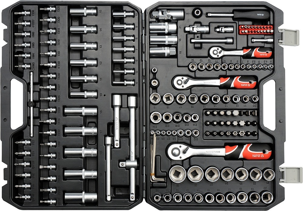 Gola sada 1/2", 3/8", 1/4" obsahuje 173ks: nástavců, prodlužovacích nástavců, ráčny s plastovou rukojetí a 72 zubým jemným chodem, kloubové nástavce a další příslušenství. Vyrobené z kvalitní chromvanadiové oceli CrMo440, CrV6150 a CrV50BV30, S2 s funkcí AS-DRIVE. Funkce AS-DRIVE umožňuje...