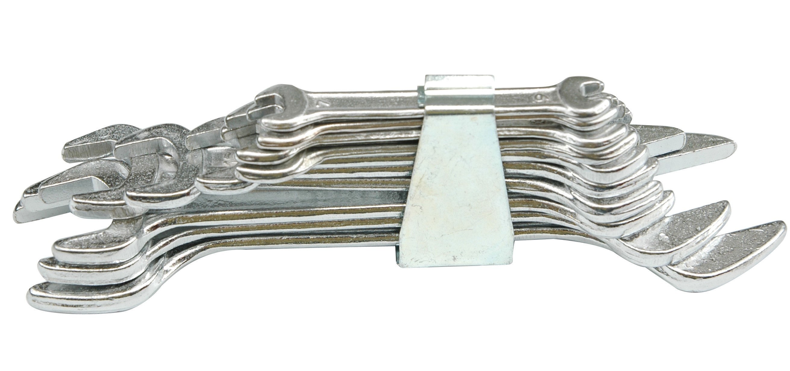 Zestaw kluczy z podwójnie otwartym końcem 6 - 32 mm. Wykonane ze stali węglowej. Głowice kluczy odchylone o 15 stopni.