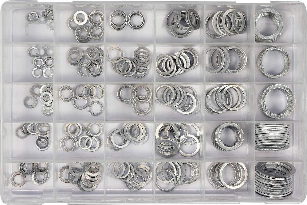 Zestaw 300 szt. wysokiej jakości aluminiowych podkładek o wymiarach od 5 x 9 mm do 28 x 36 mm, łącznie 30 rodzajów po 10 szt. każda.