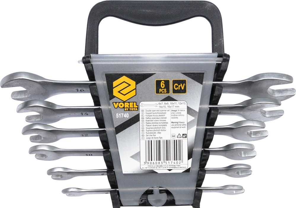 Zestaw kluczy z podwójnymi, otwartymi końcami, 6 szt. 6 - 17 mm, wykonany z wysokiej jakości stali CrV, przechowywany w przejrzystym plastikowym etui.