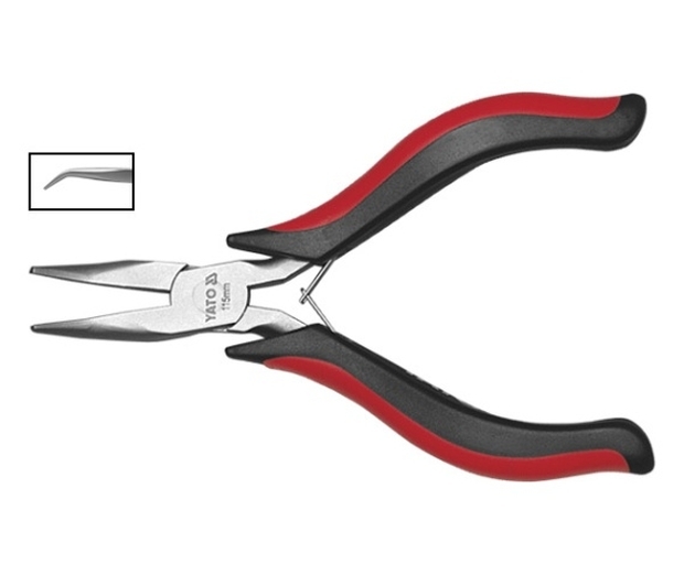 Półokrągłe zagięte mini szczypce, długość 115 mm. Wysokiej jakości małe szczypce formujące i chwytne do precyzyjnych prac montażowych i delikatnej mechaniki.