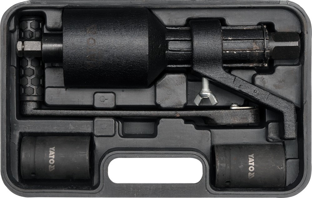 Sada je uložena v kufru, kde se nachází spolu s kovanými nástavci velikosti 32 a 33 mm, je tedy možné použít i pro sundavání kol nákladních automobilů.