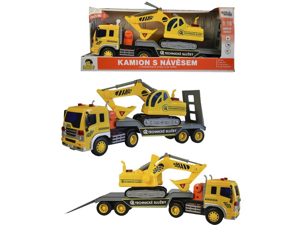 Tahač s bagrem na setrvačník, na baterie, 39cmTahač z pohyblivou rampou a bagrem, který má pohyblivé rameno. Z české kolekce City Collection.4 funkce zvuku a světlo:- Klakson- Motor- Zpátečka- JízdaHračka je určena pro děti 3+.Rozměr hračky je 39cm.Materiál hračky je plast. przeczytaj całość