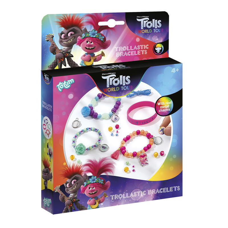 Trollové - vyrob si tři různé korálkové náramky.Vynikající hračka pro rozvoj manuální zručnosti. Vše potřebné k výrobě najdete uvnitř balení.Balení obsahuje: kovový přívěšek s 3D nálepkou, různé barevné korálky, bambulku, střapec, 3 kovové talismany, 3D transparetní samolepky, nálepku, elastickou...