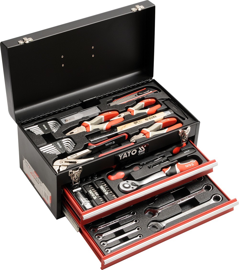 Sada základního nářadí v kovovém rozkládacím kufru vhodná pro údržbáře, nebo jako výbava do nákladního automobilu a podobných mechanizačních zařízení.• Nářadí sada 80 kusů v kovovém kufru - Yato• Obsahuje gola sadu s klíči 6 - 21 mm• Sadu stranových klíčů 6, 7, 8, 9, 10, 11, 12, 13, 14, 15, 17,...