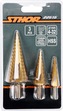 Sada 3 ks stupňovitých kuželových vrtáků na kov umožňující postupné vyvrtání více průměrů otvorů.