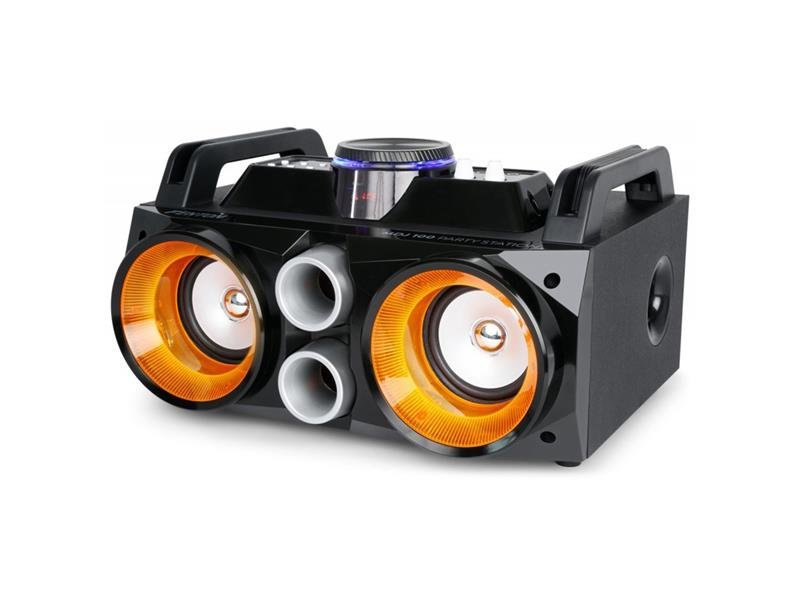 Mobilní aktivní zvuková stanice se zabudovaným MP3 přehrávačem, Bluetooth a barevným LED osvětlením. Dobíjecí baterie pro 3-4 hodiny samostatného provozu bez externího napájení. Systém je osazen dvojicí 4“ širokopásmových reproduktorů a bassreflexovou ozvučnicí pro zvýraznění silných a hlubokých basů. Reproduktory a ovladač hlasitosti jsou osvětleny barevnými LED diodami. Slot pro SD karty, USB port, Bluetooth přijímač pro streamování hudby ze smartphonů a mobilních zařízení. Linkový vstup Jack 3,5 mm na zadním panelu pro externí audio zařízení, 2× mikrofonní vstup Jack 6,3 mm s Echo efektem. Maximální výkon zesilovače 100W, informační displej MP3 přehrávače. Robustní provedení, futuristický design, dvě madla pro snadnou manipulaci. Mobilní zvukový systém se zabudovanými LED efekty je ideální pro domácí zábavu i mobilní akce.
