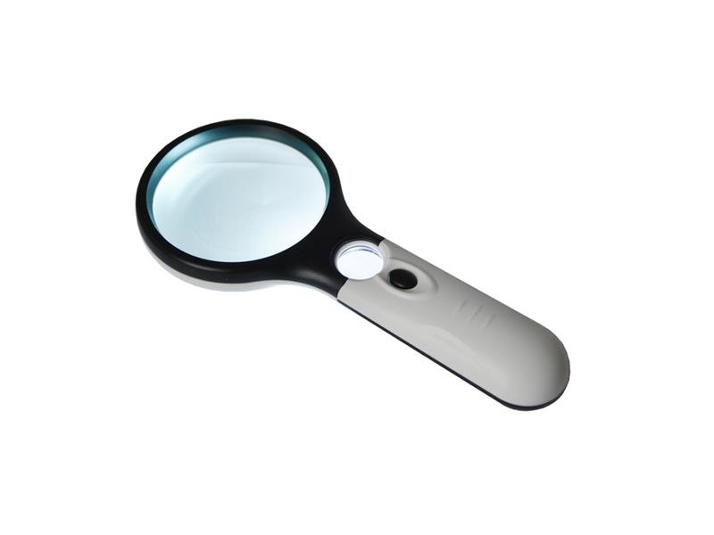 Składa się z dwóch soczewek: głównej i dodatkowej, o powiększeniu 2,5x i 45x. Dodatkowa soczewka znajduje się przy rączce. Jest to bardzo przydatne przy czytaniu tekstów oraz badaniu drobnych detali przedmiotów. Wbudowane oświetlenie LED zapewnia równomierne oświetlenie obserwowanego obiektu światłem o barwie przyjemnej dla oka. Zasilanie zapewniają trzy baterie AAA (nie są dołączone). Do włączania i wyłączania oświetlenia służy przycisk na rączce. Parametry produktu: 2 stopnie powiększenia 2,5x / 45x