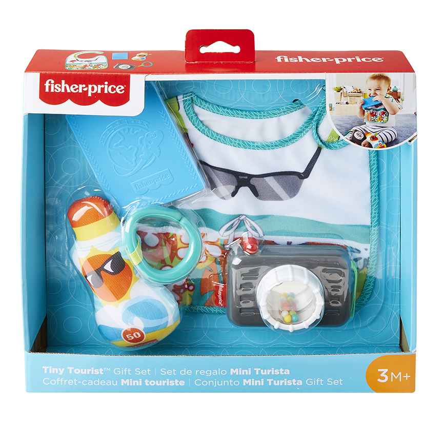 Děťátka žijí pro dobrodružství! S Fisher-Price® Dárkovým setem pro malé turisty se mohou malí milovníci cestování vydat na různá místa a být vybaveni 4 doplňky na dovolenou. Set 4 tematických hraček pro kojence obsahuje falešný foťák, který chrastí a cvaká, šustivou lahvičku opalovacího krému,...