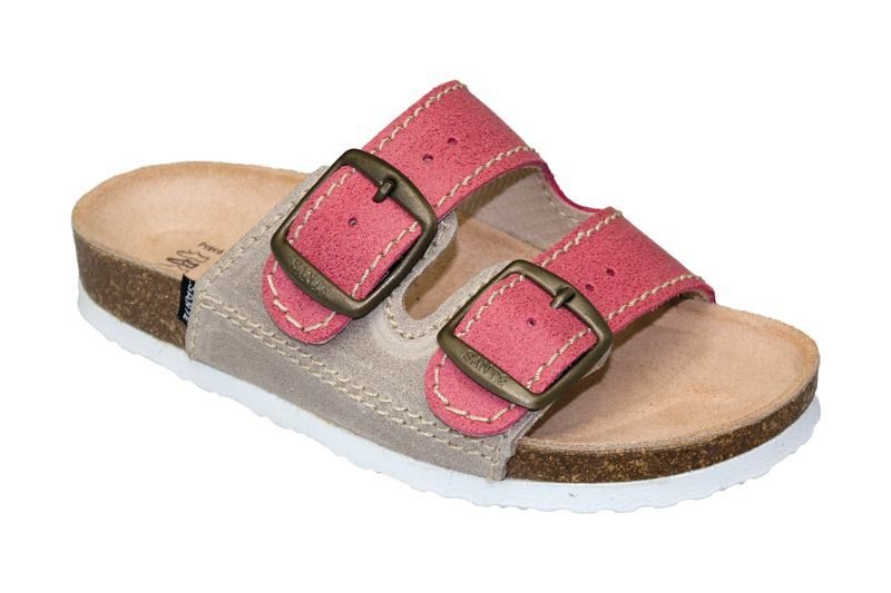 Zdravotní obuv - dětské pantofle,barva: růžová, šedá,podešev: bílá,stélka: anatomicky tvarovaná, kožená,materiál: kůže,přezky pro upravení velikosti,obuv podporující správný vývoj nohy. przeczytaj całość