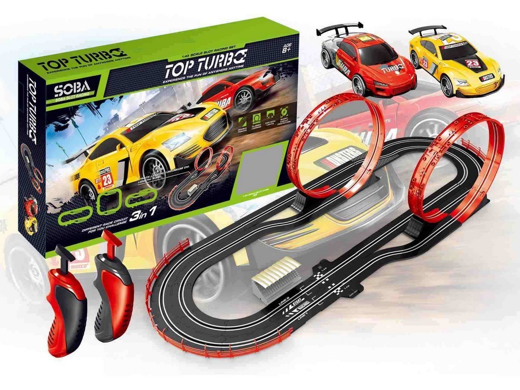 Autodráha na baterie se dvěma lopingy. Délka dráhy 560 cm, rozměry složené dráhy 138 x 58 x 36 cm. Autodráha obsahuje dva sportovní vozy, rovinky, zatáčky, díly pro dva lopingy, zúžení, napájecí díl na 8 baterií (baterie nejsou součástí), ovladače, svodidla a další příslušenství. Obal obsahuje...