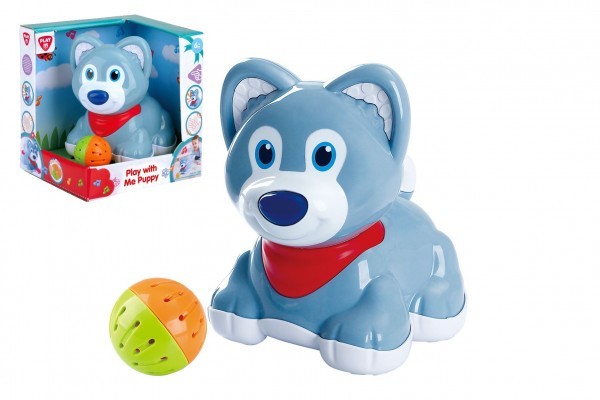 Pes/pejsek s míčkem plast na baterie se zvukem v krabici 19x20x16cm 6m+