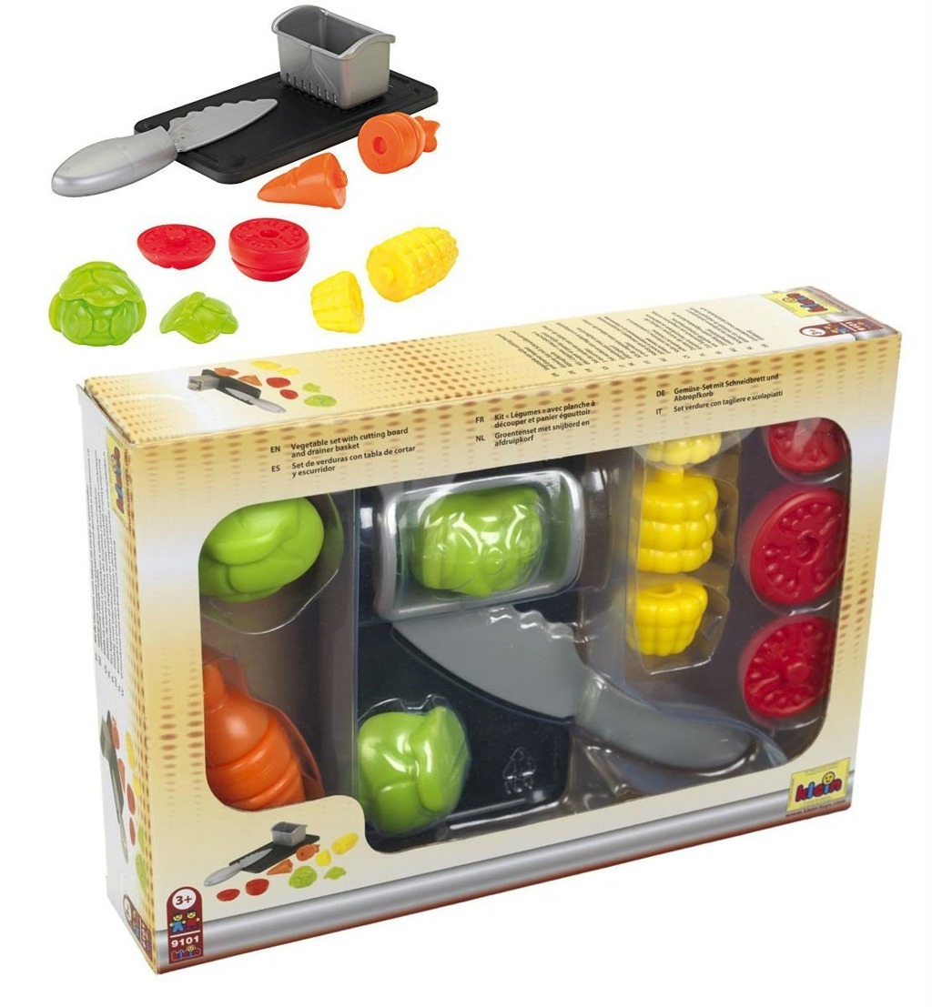 Zeleninová souprava s prkénkem a nožem. Plastová sada obsahuje zeleninu -rajčata, kukuřici, salát a mrkev. Kousky zeleniny se můžou k sobě spojit i oddělit. Součástí balení je také plastový nůž, prkýnko a odkapávací mistička. przeczytaj całość