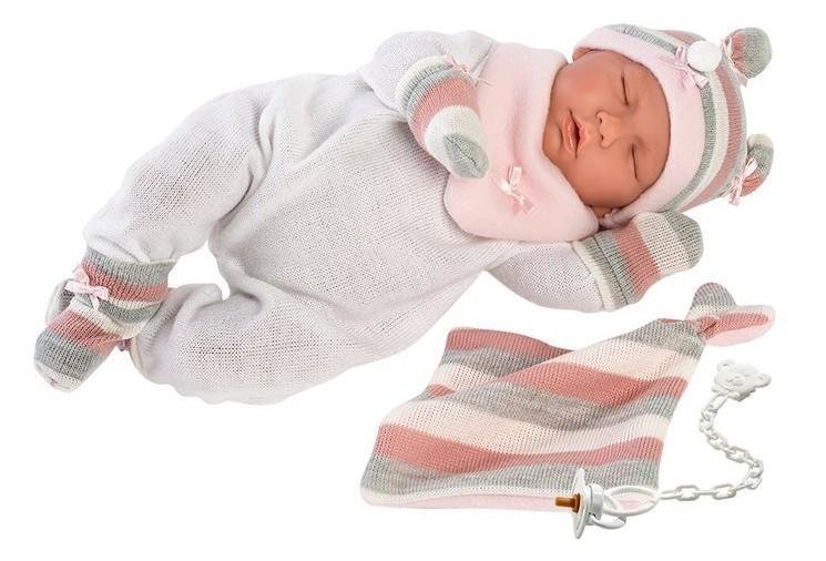 Mluvící miminko s měkkým látkovým tělem, které po zatlačení na hrudník začne říkat „mama“, „papa“ a vydávat reálný zvuk plačícího miminka. Ruce a nohy jsou k tělu přichyceny kloubem. Miminko je polohovací a může i sedět. Velikost 42 cm. Součástí balení je 3 x knoflíková baterie LR44. przeczytaj całość