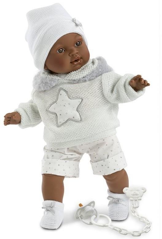 Mluvící panenka s měkkým látkovým tělem a s vlásky po celé hlavě. Po vytažení dudlíku z úst začne panenka říkat „mama“, „papa“ a vydávat reálný zvuk plačícího miminka. Panenku lze utišit dudlíkem. Velikost 38 cm. Součástí balení je 3 x knoflíková baterie LR44. przeczytaj całość