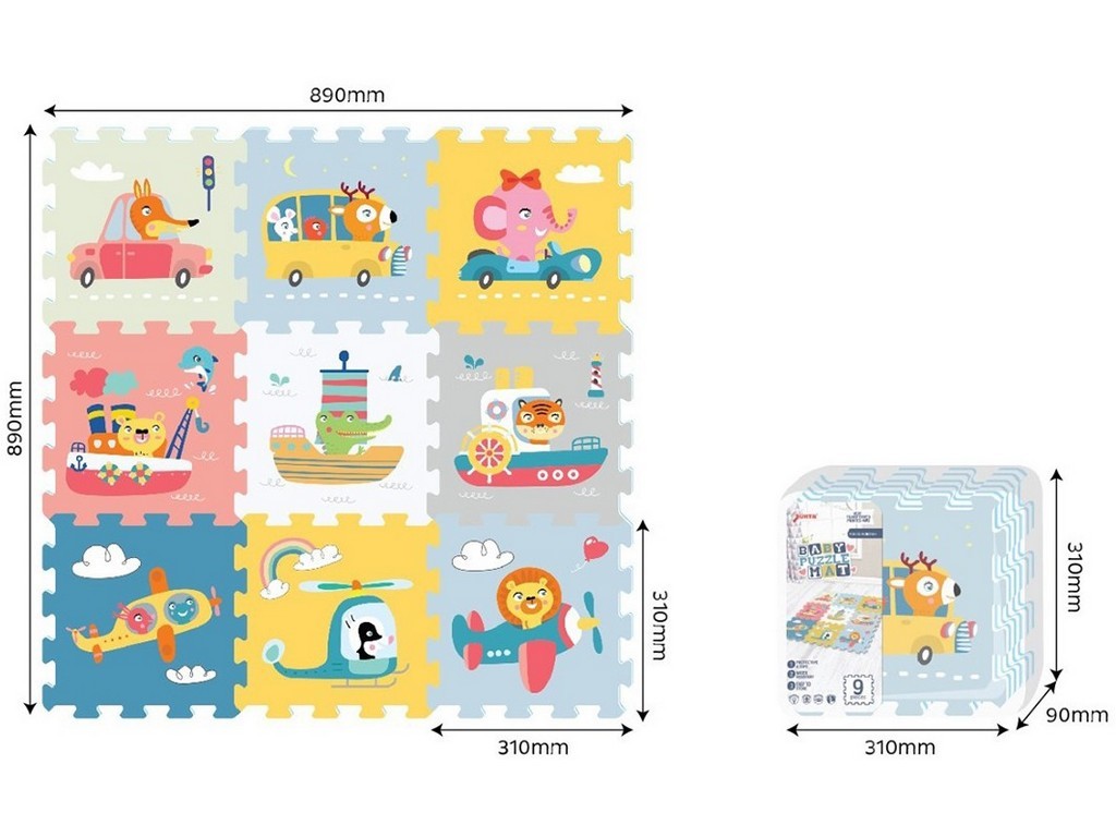 Puzzle s dopravními prosředky a zvířátky, 9 ksHračka je určena pro děti 10m+.Rozměr hračky je 31x31cm.Materiál hračky je pěna.Balení hračky je fólie. przeczytaj całość