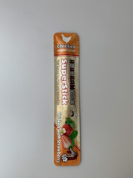 Doplňkové krmivo pro psy.Salám z kuřete a jahody - přírodní masová pochoutka pro psy.Krmny? návod: Podávejte jako odměnu při tréninku. Zajistěte dostatek čerstvé vody.Složení: Kuřecí maso 64%, jahoda 10%, rostlinný protein 10%, pšeničná mouka 6%, rostlinný glycerin 6%, sorbitol 4%, sůl...
